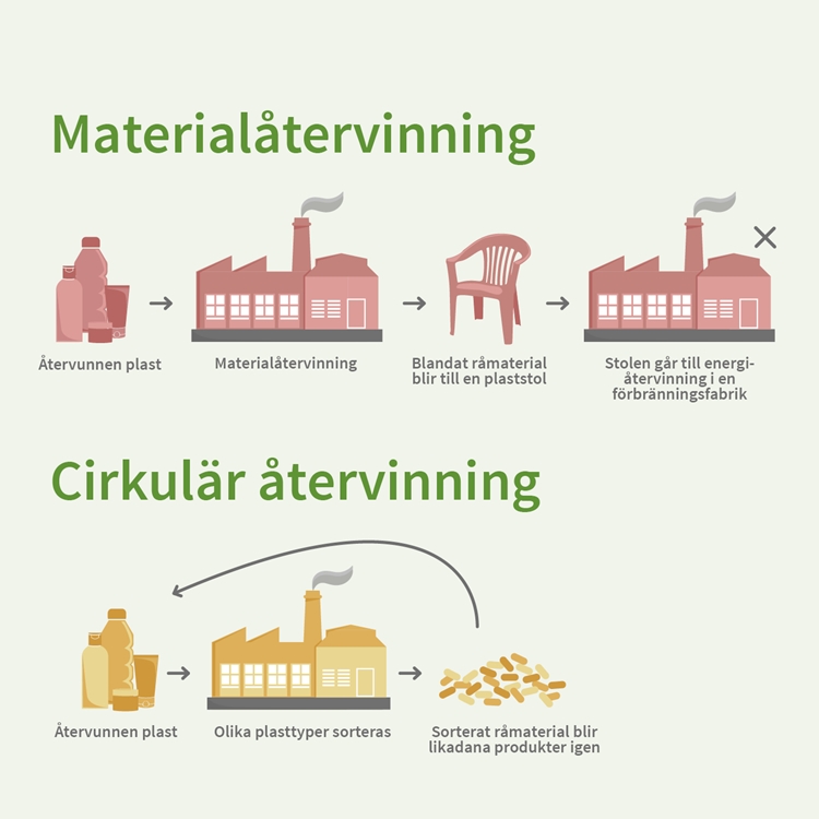 Linjär materialåtervinning innebär att plasten vi återvinner omvandlas till råmaterial för nya produkter, som till exempel en plaststol. Stolen kan i sin tur inte materialåtervinnas, eftersom den består av olika plasttyper, och måste därför eldas upp när den nått slutet av sin livscykel (detta kallas för ”downcycling”).