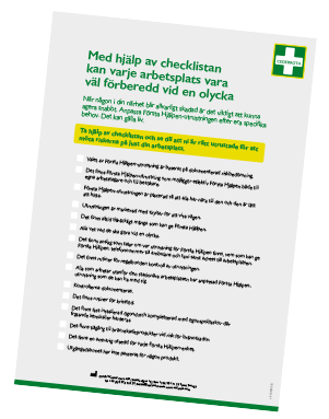 Använd checklistan för att säkerställa att arbetsplatsen är rätt utrustad. Den hjälper dig att identifiera vad som behövs vid en olycka och refillguiden ger en tydlig överblick över vilka produkter som ingår i de olika kiten.
