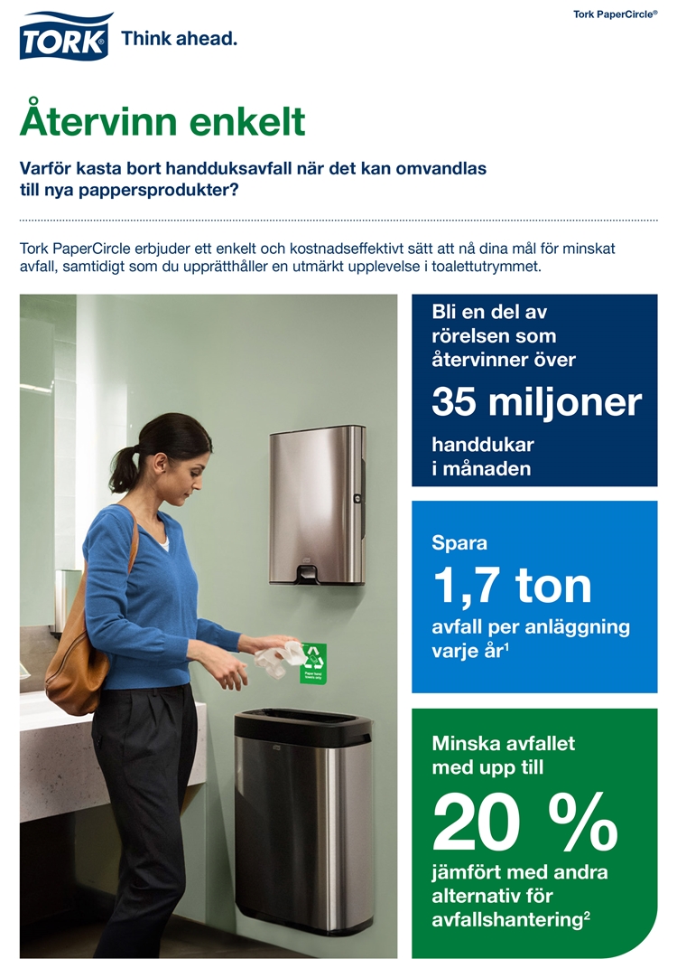 Tork PaperCircle® är världens första återvinningstjänst för pappershanddukar. Genom att samla in dem i en separat papperskorg kan företag bidra till ökad återvinning och cirkuläritet.
