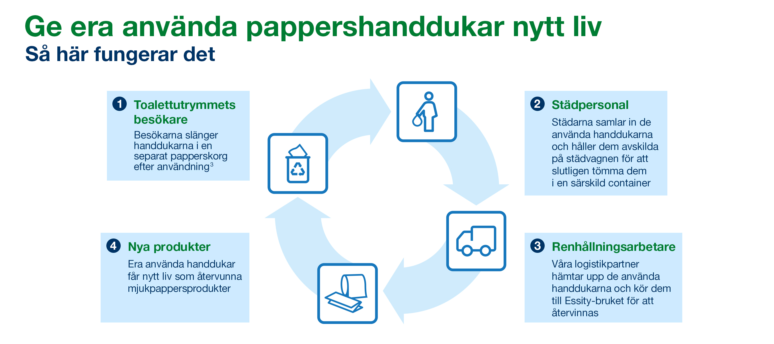 Lösningen från Tork är enkel. Besökare använder hygienutrymmen som vanligt, men slänger handdukarna i en separat papperskorg. Lokalvårdare gör en visuell besiktning och ser till att det bara är papper som är slängda. Därefter körs de till en uppsamlingsplats innan vidare transport till pappersbruket i Lilla Edet. Där hamnar de på en egen produktslinga som tillverkar och återför nya handdukar till kretsloppet.