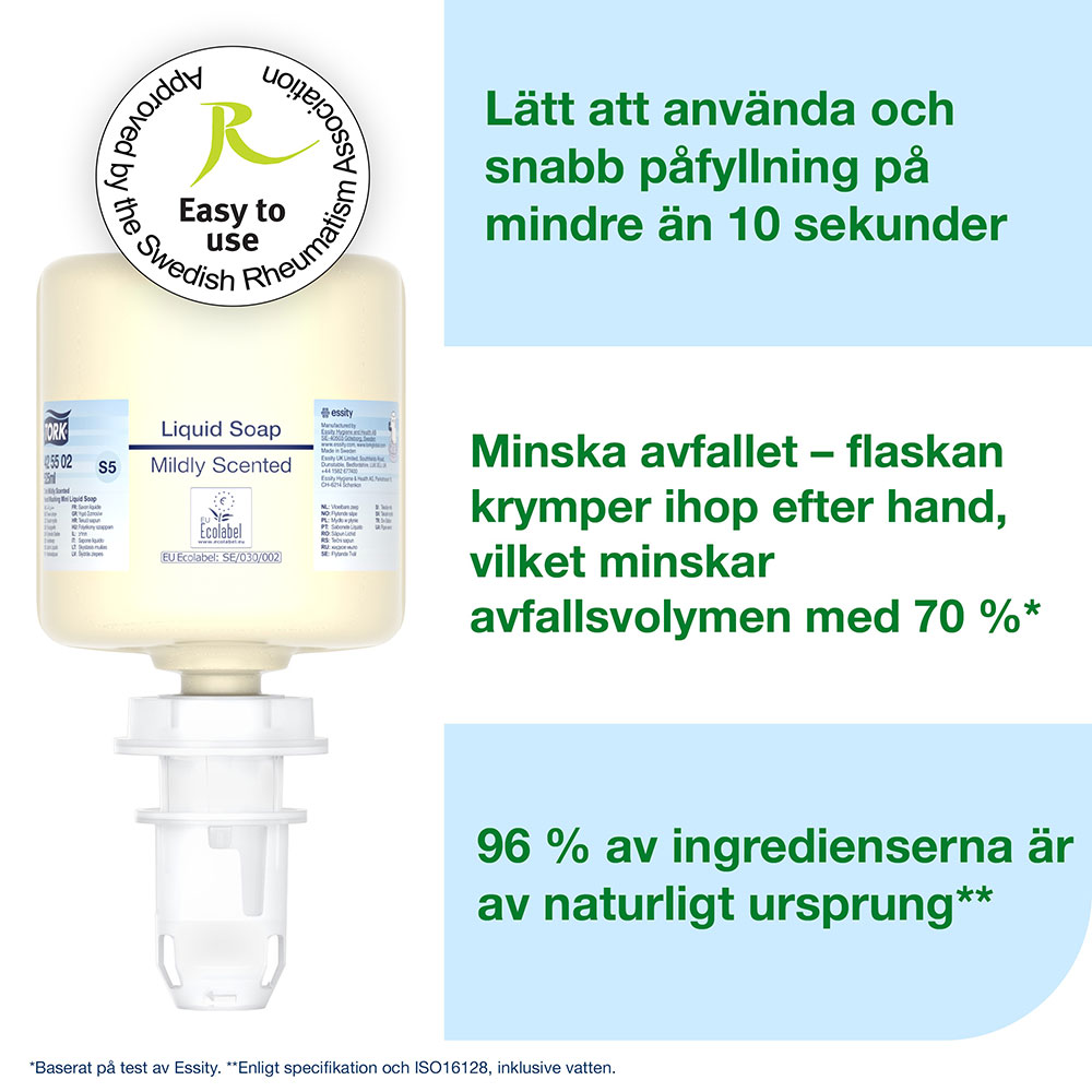 Tvål Tork Mild Mini S5 är en milt parfymerad handtvål med återfuktande och uppfriskande ingredienser för en skonsam handtvätt. Kompatibel med Tork S5 dispensrar. Hudvänligt pH och dermatologiskt testad.