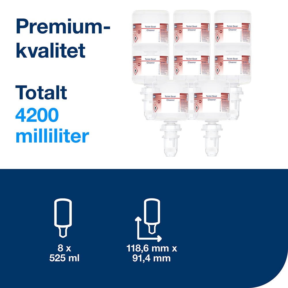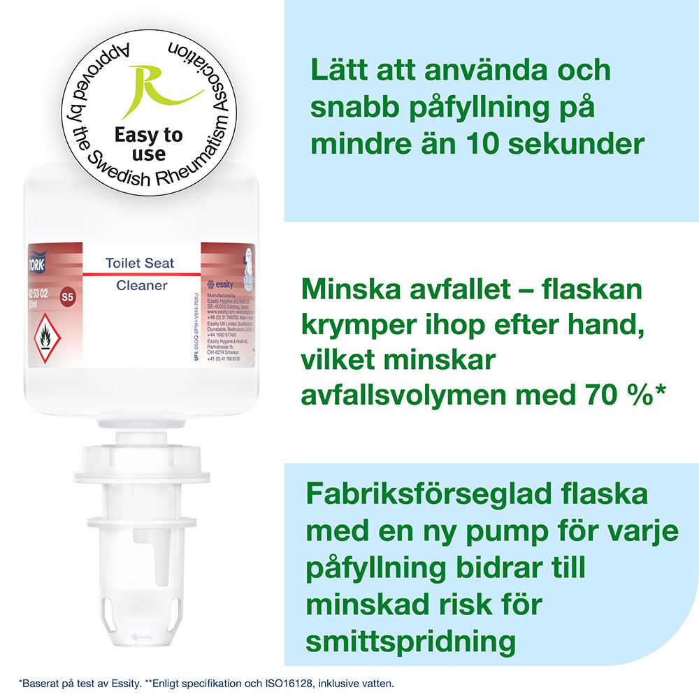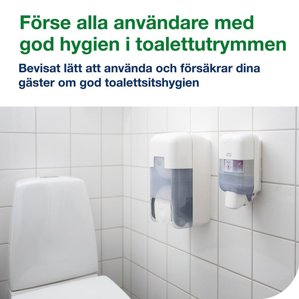 Toalettsitsrengöring Tork Mini S5 säkerställer en renare toalettsits. En dos toalettsitsrengöring på en bit toalettpapper ger besökarna extra trygghet och komfort. Kompatibel med Tork S5 dispensrar.