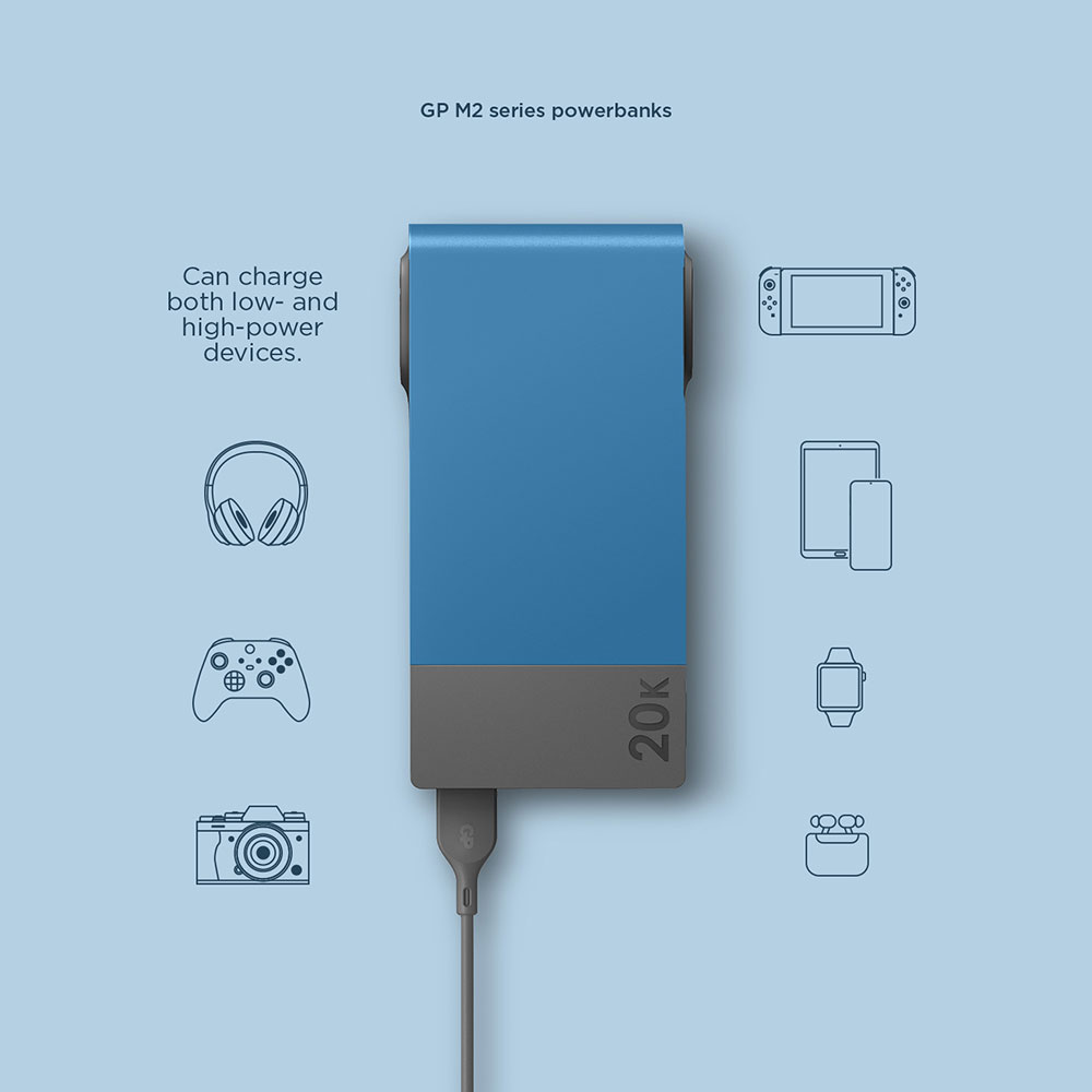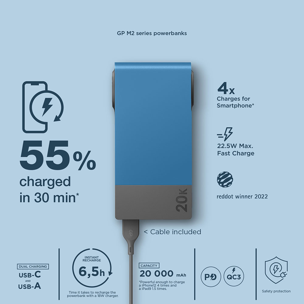 Powerbank GP M2 laddar telefoner till mer än 55% på bara 30 minuter. En fulladdad M2 Powerbank räcker till 4x laddningar för en smartphone. Med sex olika säkerhetsfunktioner och sin robusta konstruktion kommer denna powerbank bli den bästa sidekick för många år framåt. Stödjer PD och QC laddning.