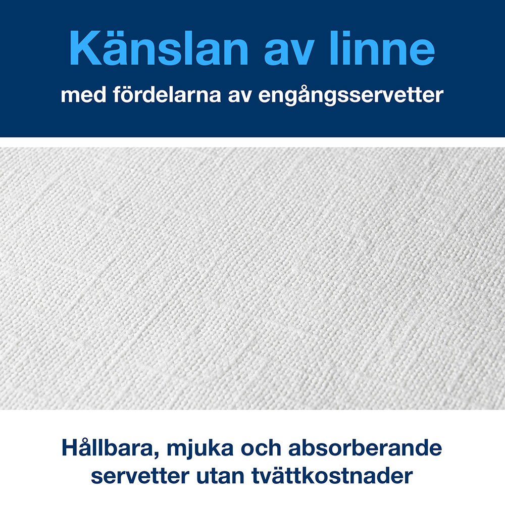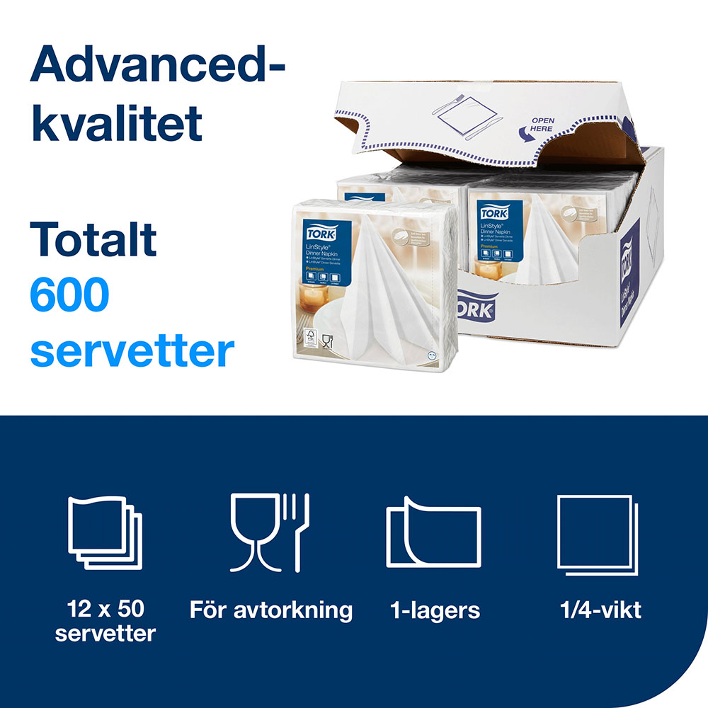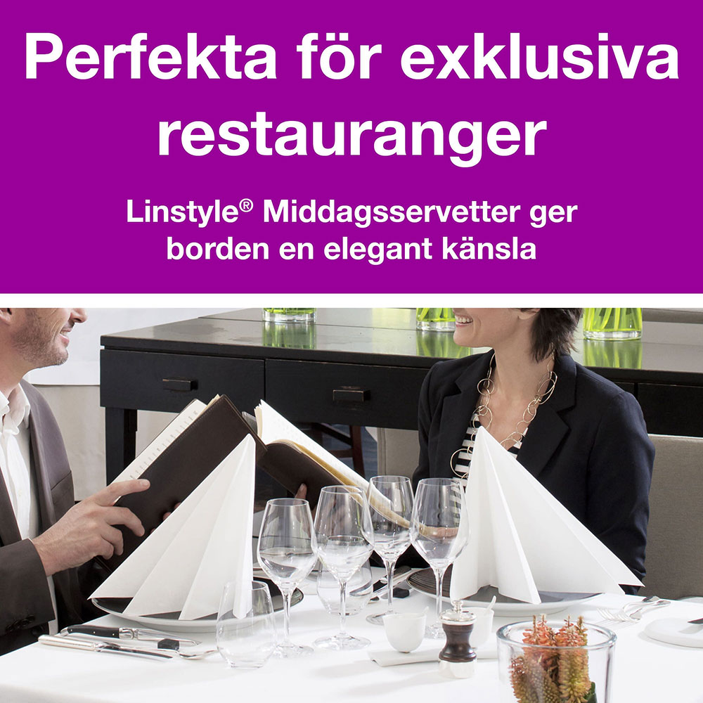 Servett Tork LinStyle® är en middagsservett med hög kvalitet och med linnetextur. Passar för restauranger som vill ha högkvalitativa servetter och ge en känsla av lyxigt linne men föredrar engångsservetter. Mjuka med bra uppsugningsförmåga. Finns i flera färger.