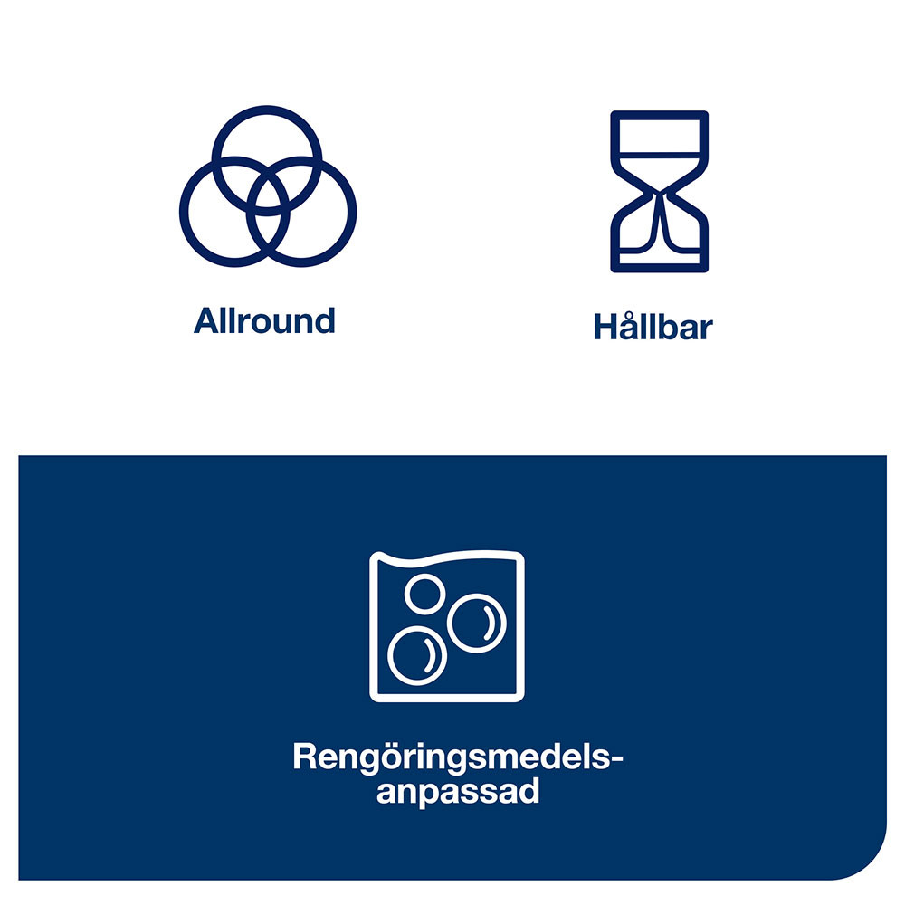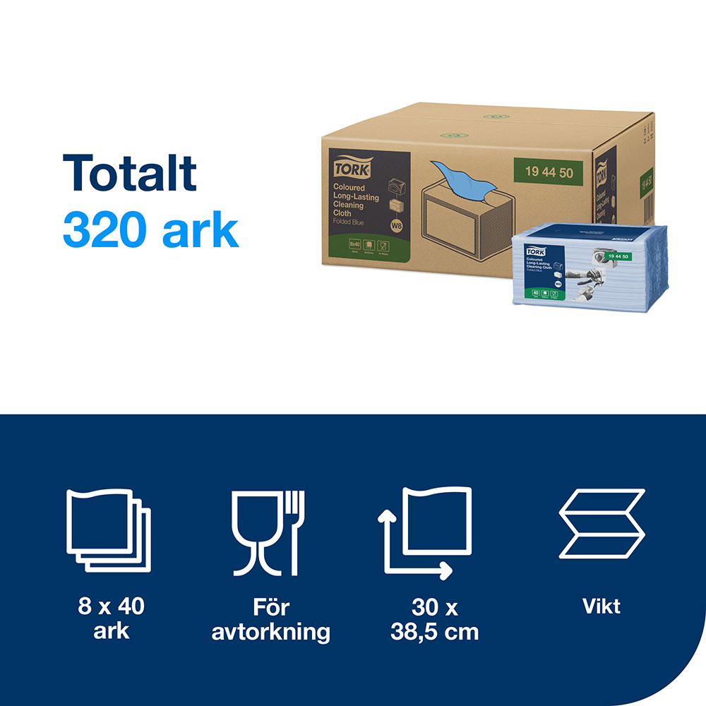 Rengöringsduk Tork W8 är en slitstark rengöringsduk av nonvowen-material. Kan användas flera gånger vilket minskar avfall och totalkostnader. Med hjälp av de olika färgerna kan olika arbetsuppgifter färgkodas för att förhindra korskontaminering – välj mellan blå, grön, gul eller röd färg. Lämplig som städ- eller diskduk och kan användas med de flesta lösnings- desinfektions- och rengöringsmedel. Kombinera tillsammans med Tork W8 Dispenser Small Pack.